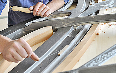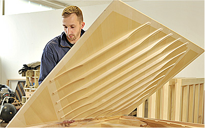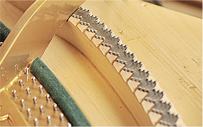 音板的功能相當于擴音器的發音膜, 存在一個弧度,這樣的弧形必須能長期保持穩定不變形,并且承受250公斤左右的壓力。拱型的音板類似于高頻、中頻、低頻的揚聲器,因為每一塊都取自不同生長期的木塊,我們對每一塊音板都必需經過嚴格的音質測試, 挑選發音優質的音板使用。 這個測試是以沙子實驗為基礎,來決定音板各部位的厚度,使高低音的音色過渡均勻。為了使鋼琴共鳴系統更大,我們進行了超寬的音板1450mm規格設計。