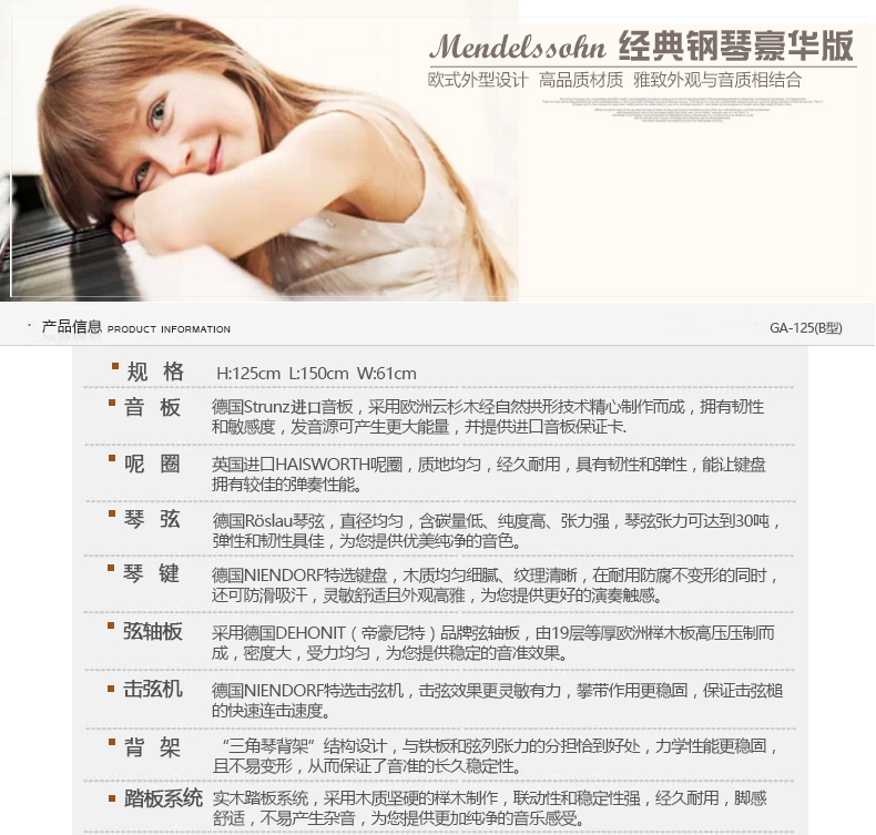 弦軸:德國鋼琴弦軸,質地均勻,不易斷裂,具有高精度和光滑度的特點。專業性強,與弦軸板組合更加嚴密,可承受琴弦的最大張力,不 易松動,為您提供更加穩定的音色。