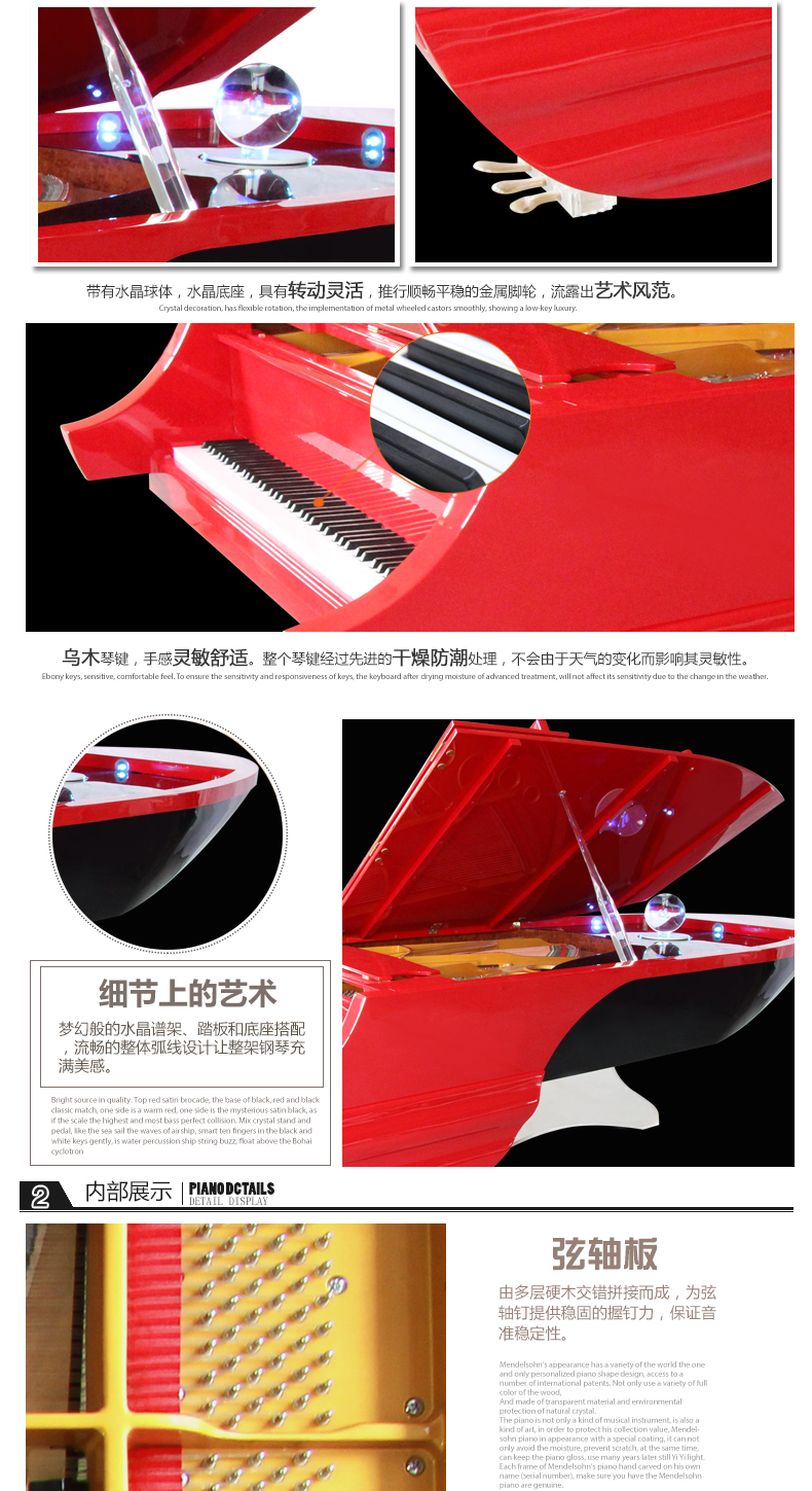 “飛艇”鋼琴的設計理念源于“自由”和“執著”,寓意著人們可以自由徜徉在音樂的海洋,乘風破浪,朝向夢想,勇往直前!當靈動的十指在黑白鍵上輕輕的撫過,仿佛海水在敲擊琴弦,流暢的旋律噴涌而出,靜靜地飄蕩回旋在那藍天碧海之間。 璀璨源于品質,尊貴源于細節,奢華亮麗的飛艇外觀設計,錦紅色的頂蓋、段黑色的底沿,與夢幻般的水晶譜架、踏板和底座相搭配,流暢的整體弧線設計讓整架鋼琴充滿美感。